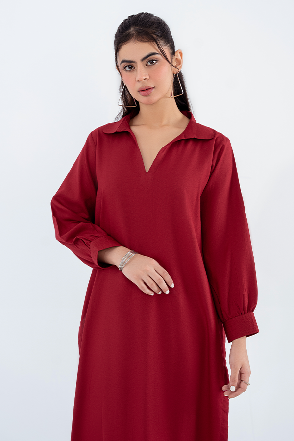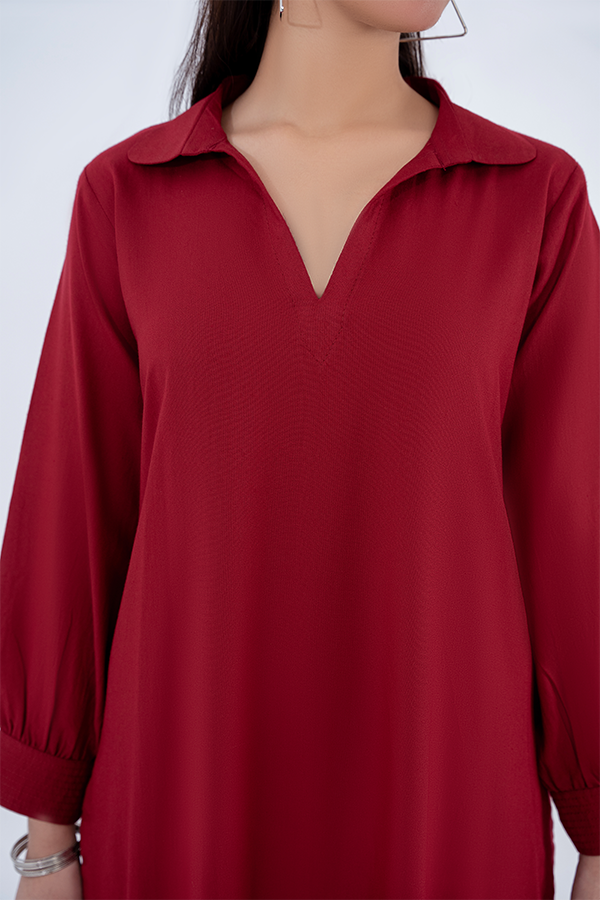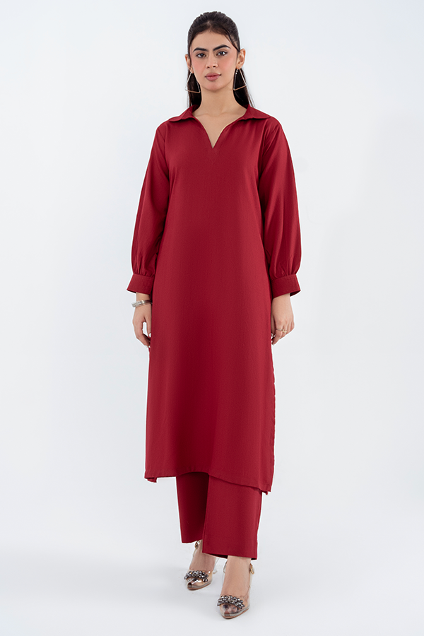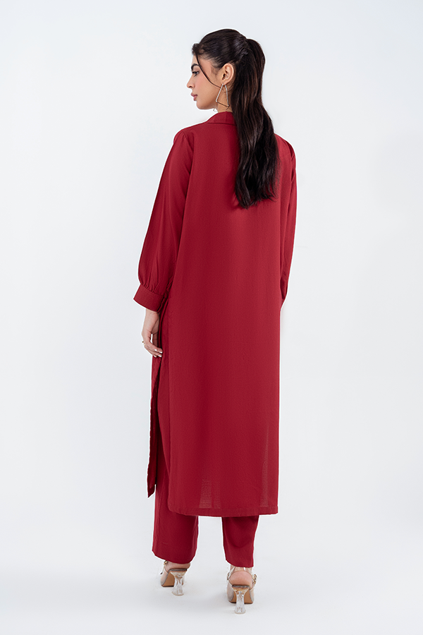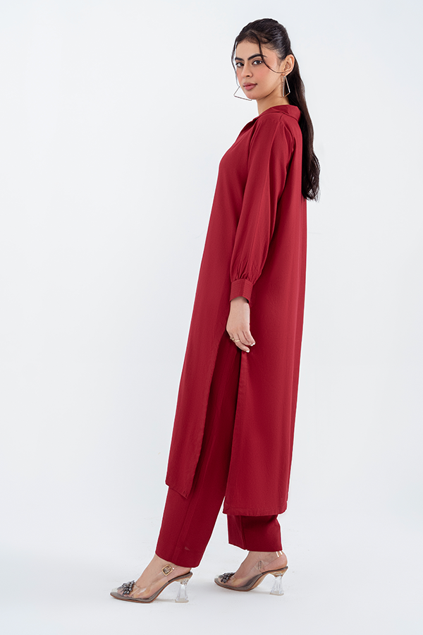 Make a bold statement with our Ruby Red Elegance Two-Piece Co-ord Set, expertly crafted from premium Acrylic Silk Wool. The stunning ruby red shirt features Classic collar neck design for a timeless look. Cuff details on sleeves adding a touch of sophistication. Relaxed fit with a clean silhouette