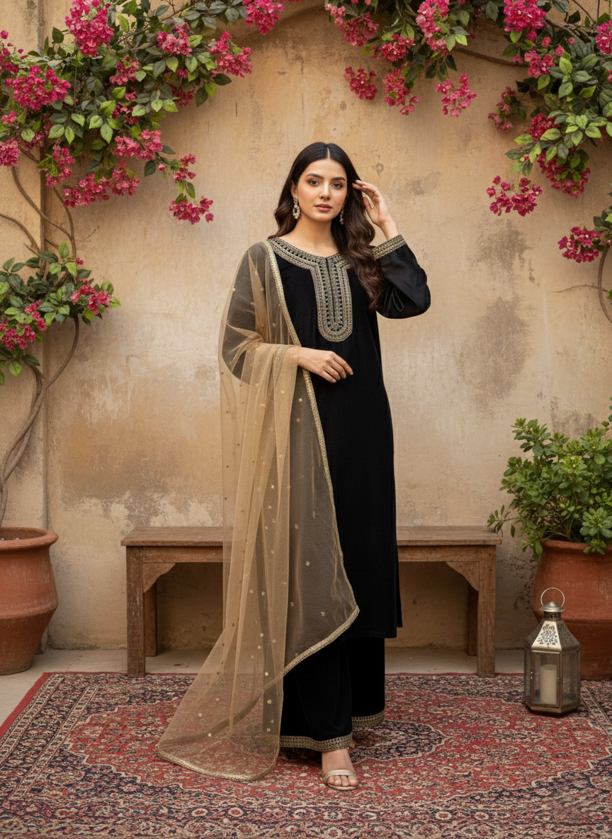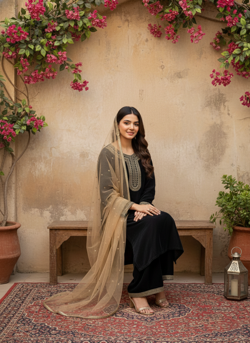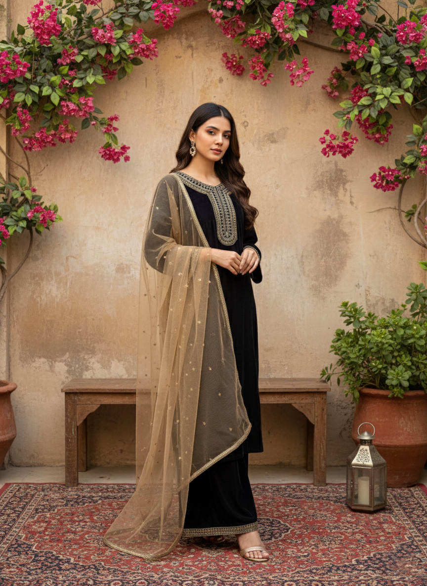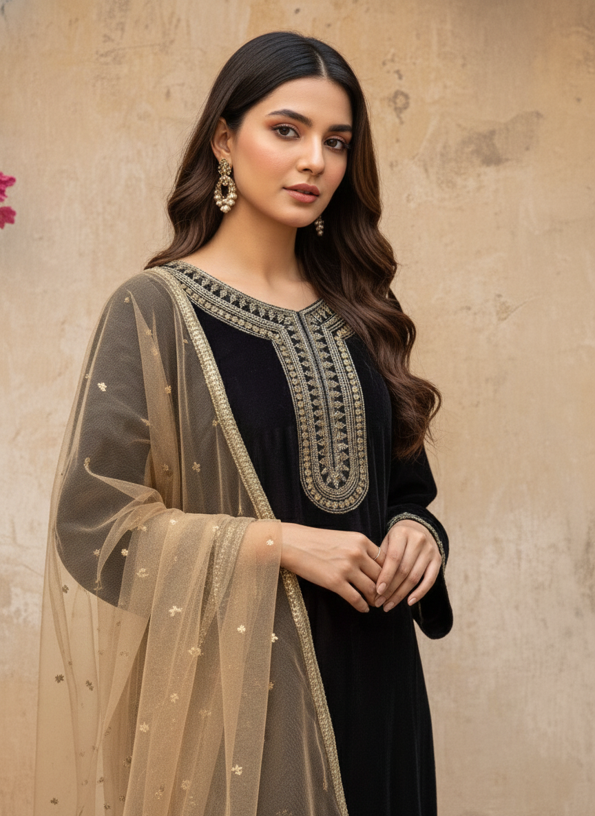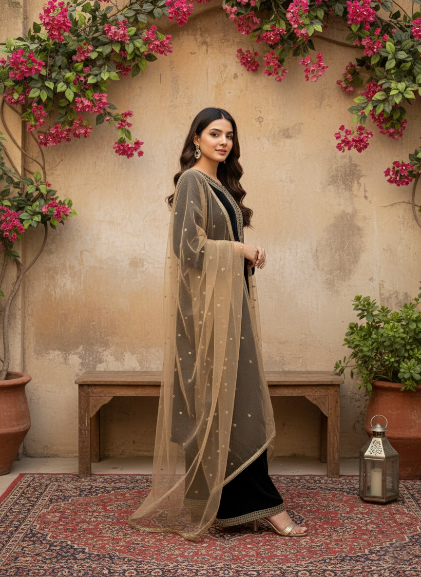 Paired with a delicate Embroidered net dupatta, this ensemble brings a soft, ethereal charm that complements the deep, elegant tones of the velvet.