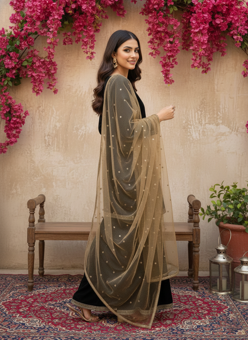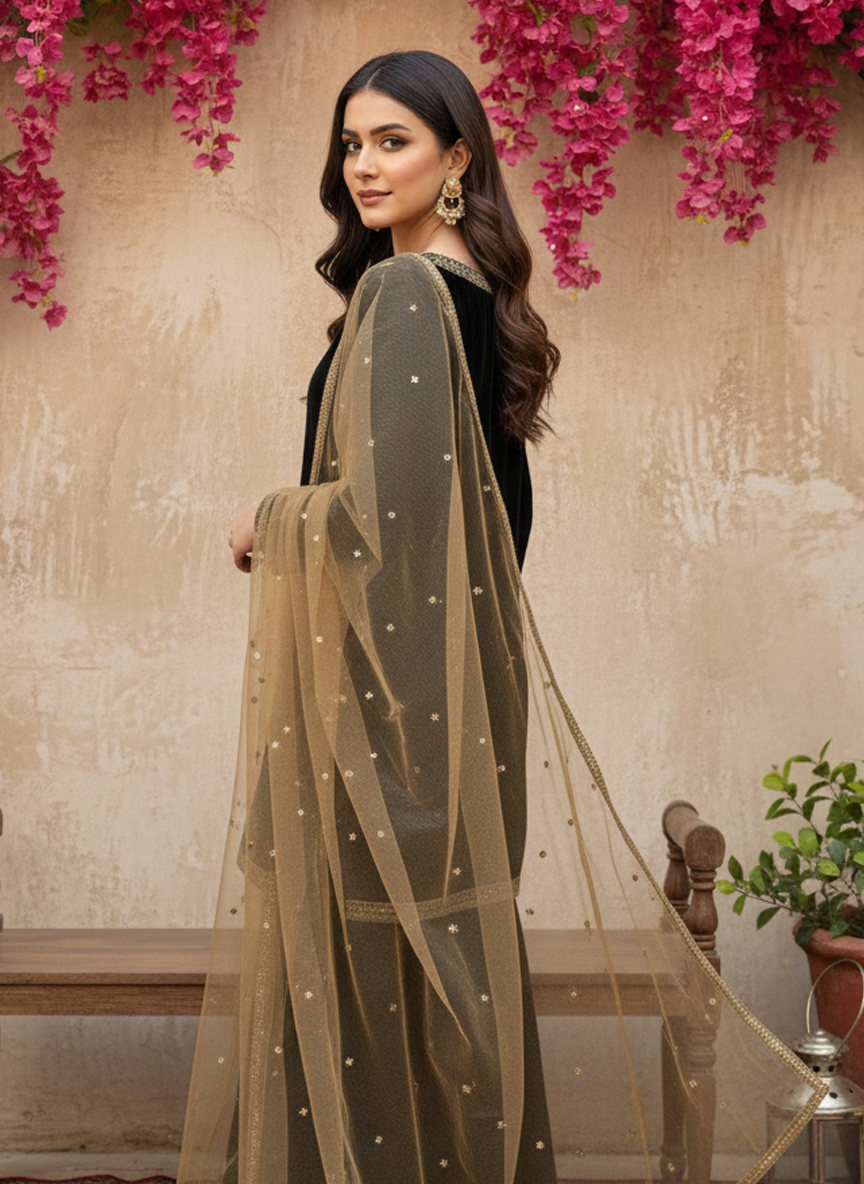 Paired with a delicate Embroidered net dupatta, this ensemble brings a soft, ethereal charm that complements the deep, elegant tones of the velvet.