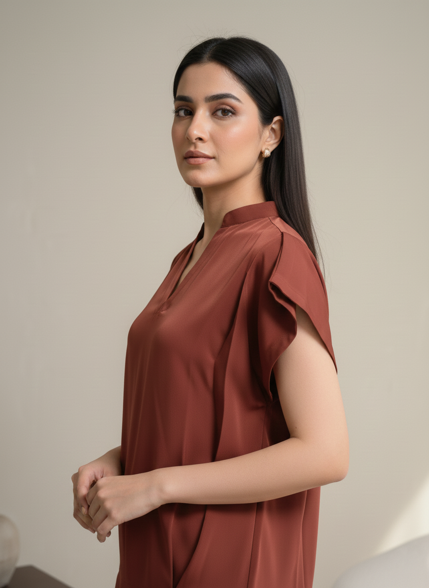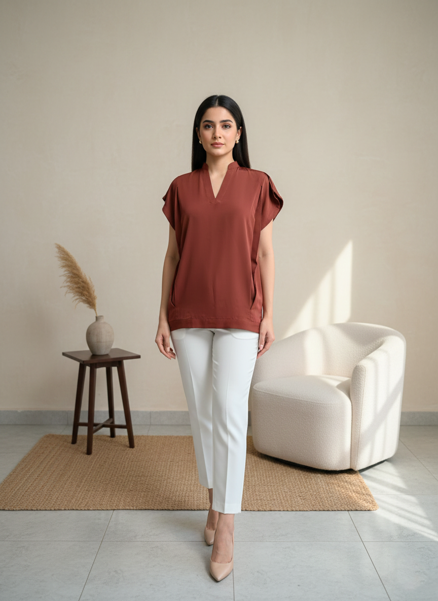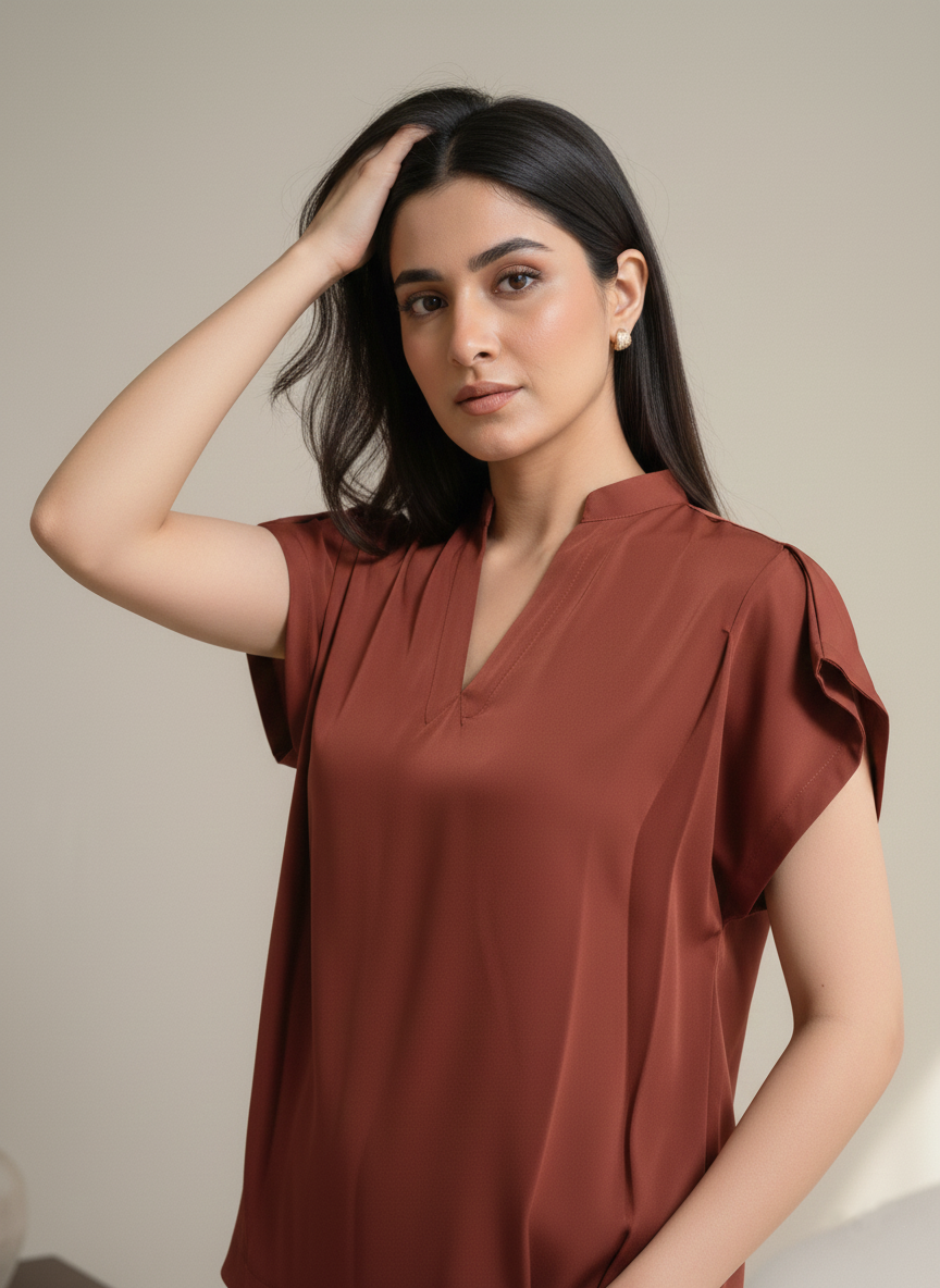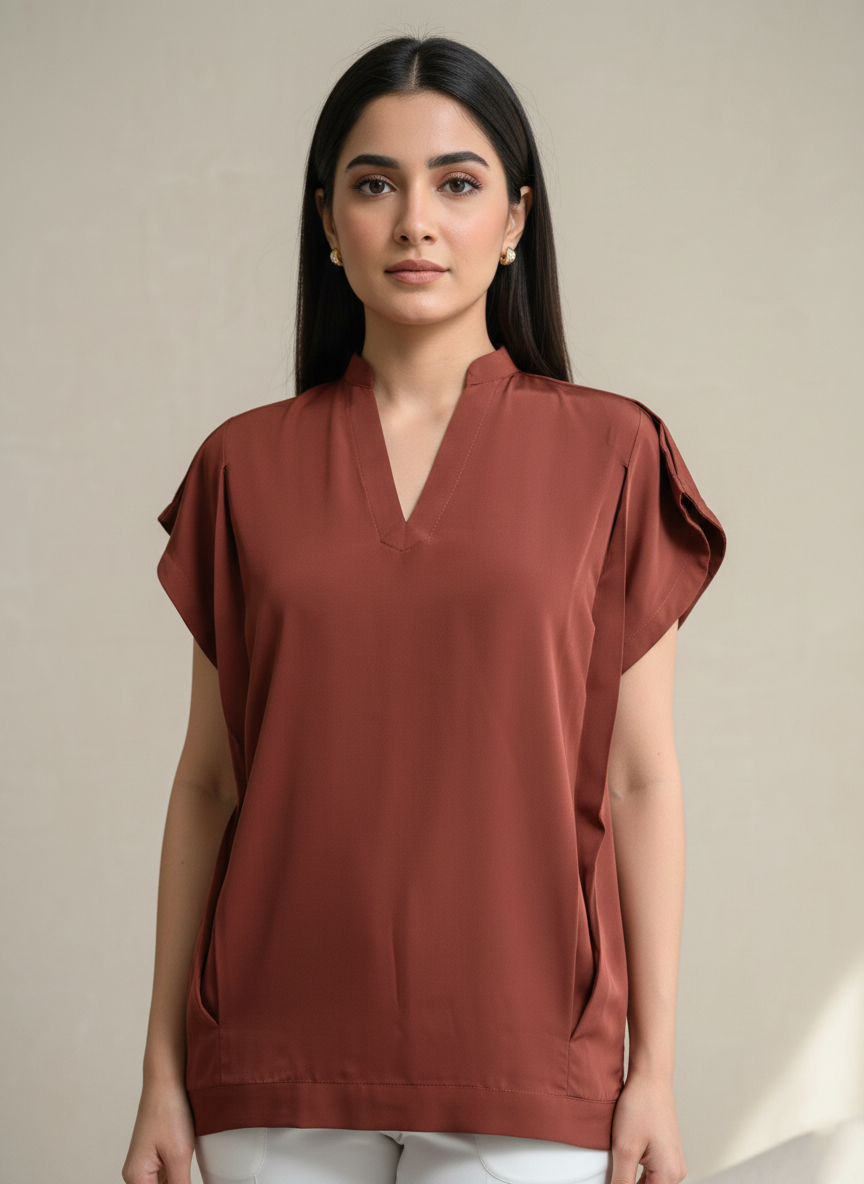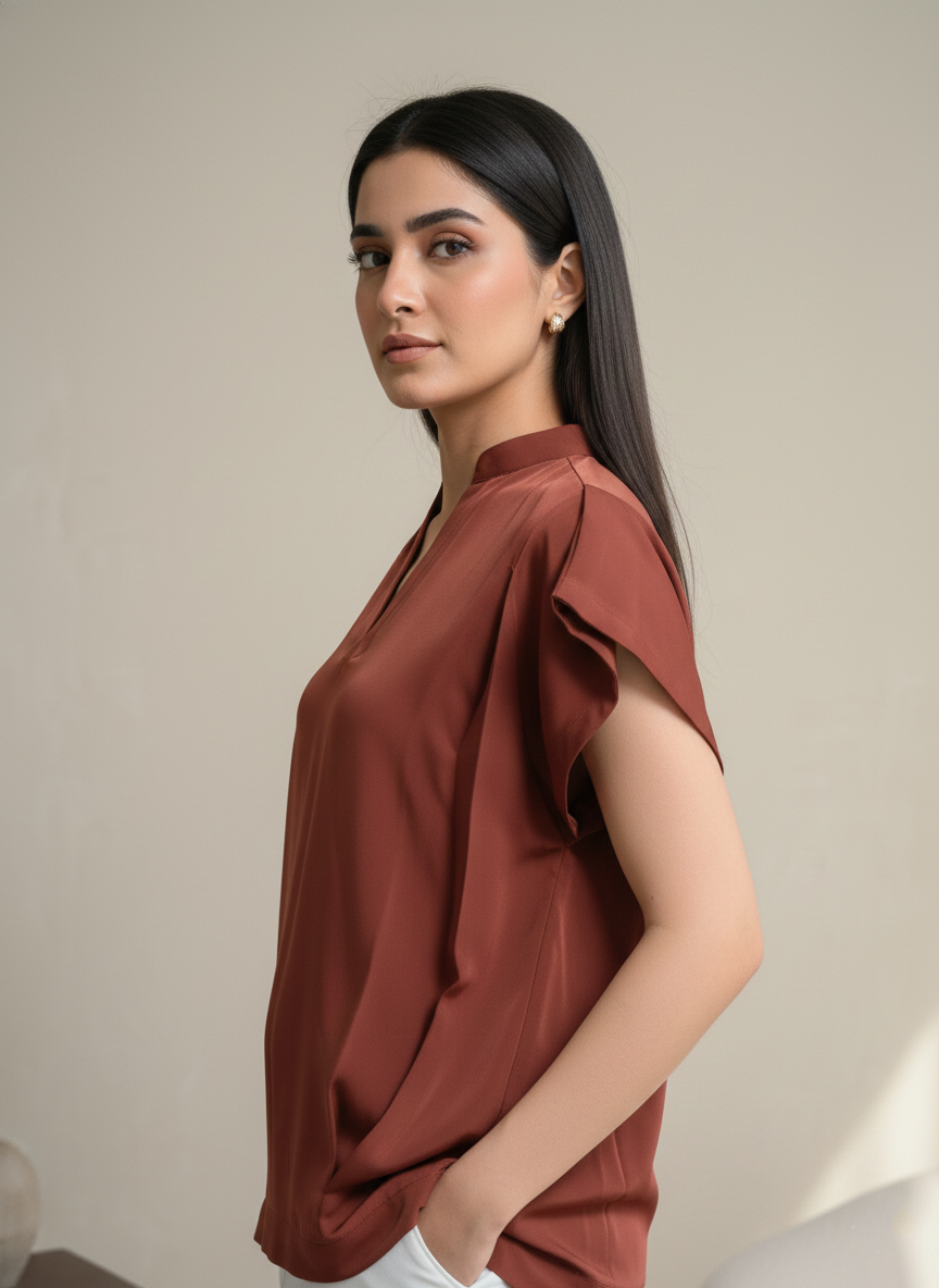 Detail: Modern pleated blouse styled with a sharp V-neck and sleek short sleeves