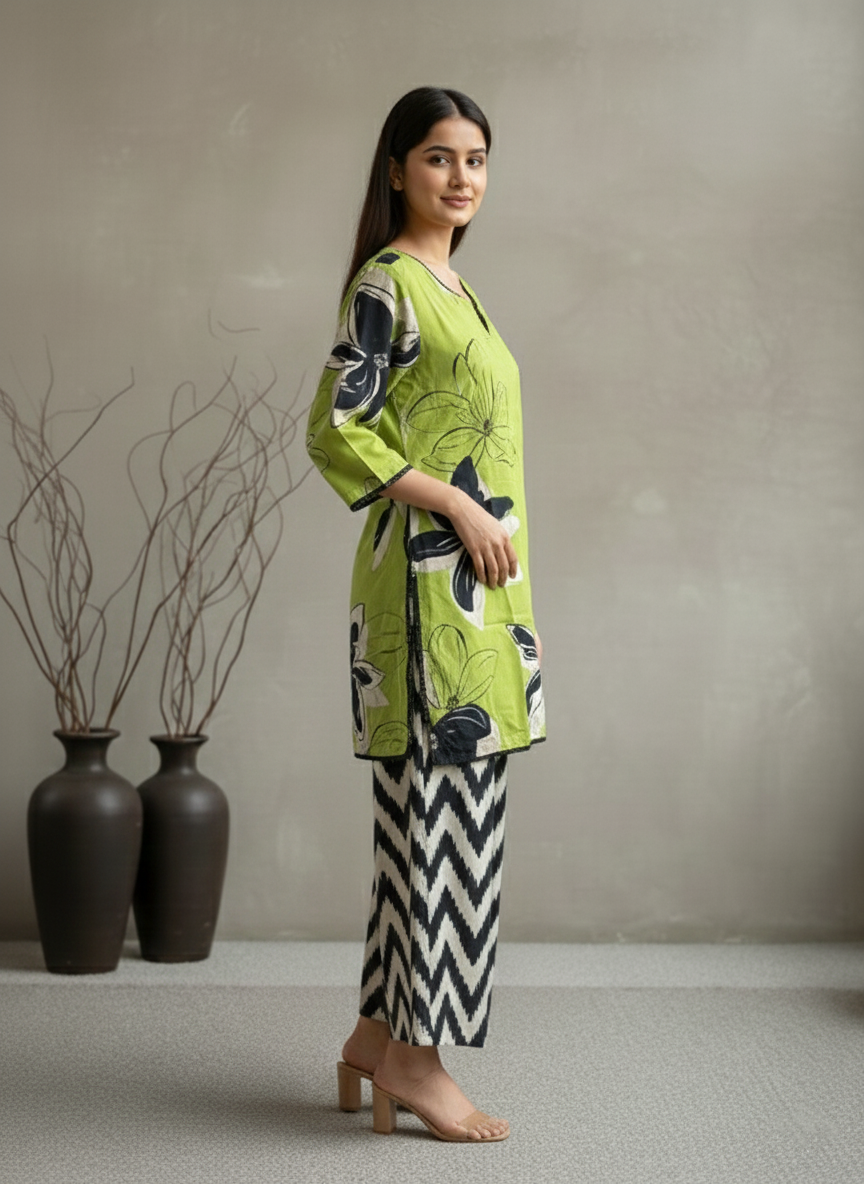 Made from lightweight Poly Lawn, this suit features a vibrant lime green tunic adorned with bold black and white prints. The accompanying shalwar showcase a striking black and white chevron pattern, creating a modern, high-contrast look. This set is designed for those who want a casual yet edgy style, offering a uniquely contemporary and chic ensemble.