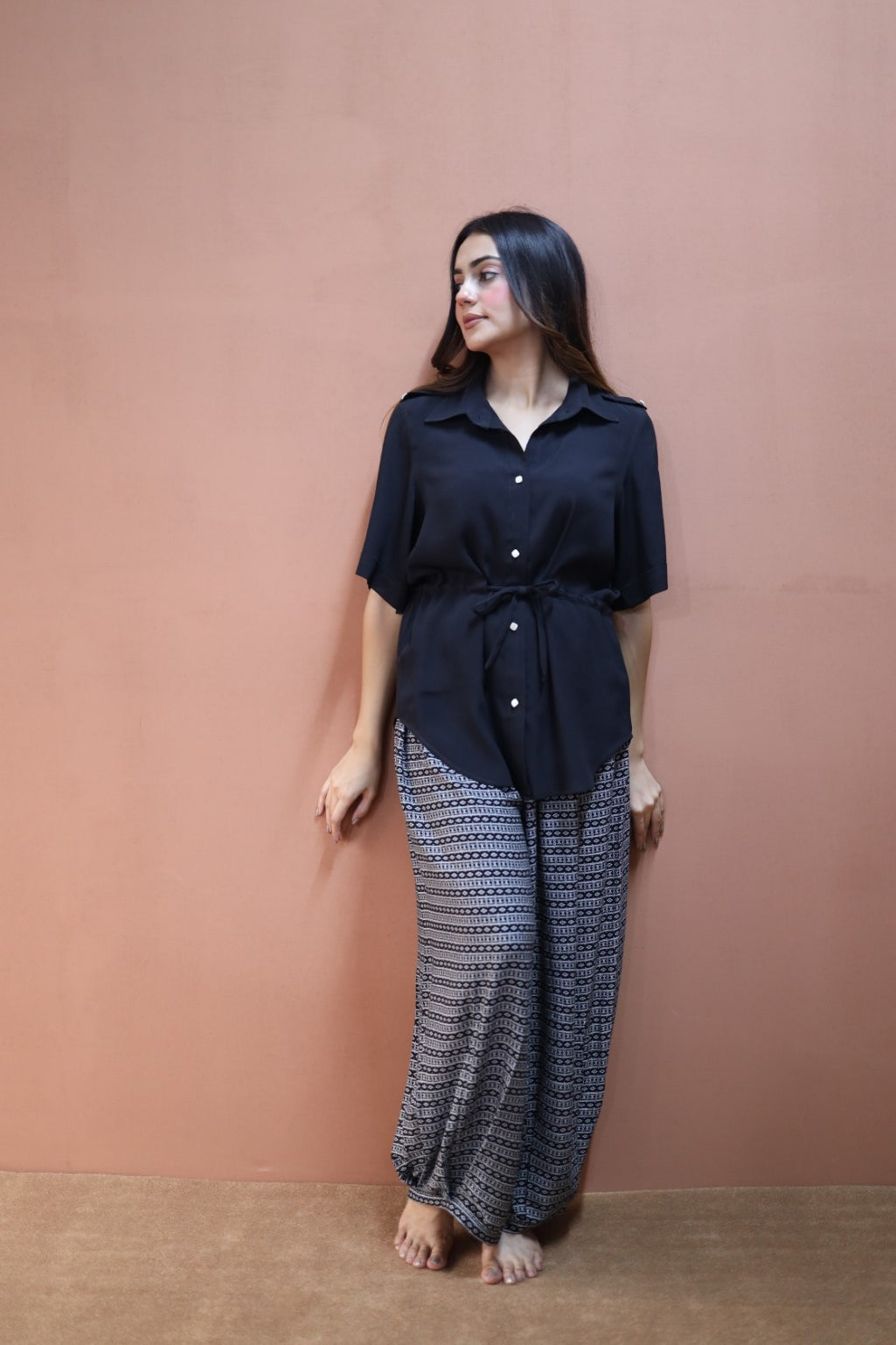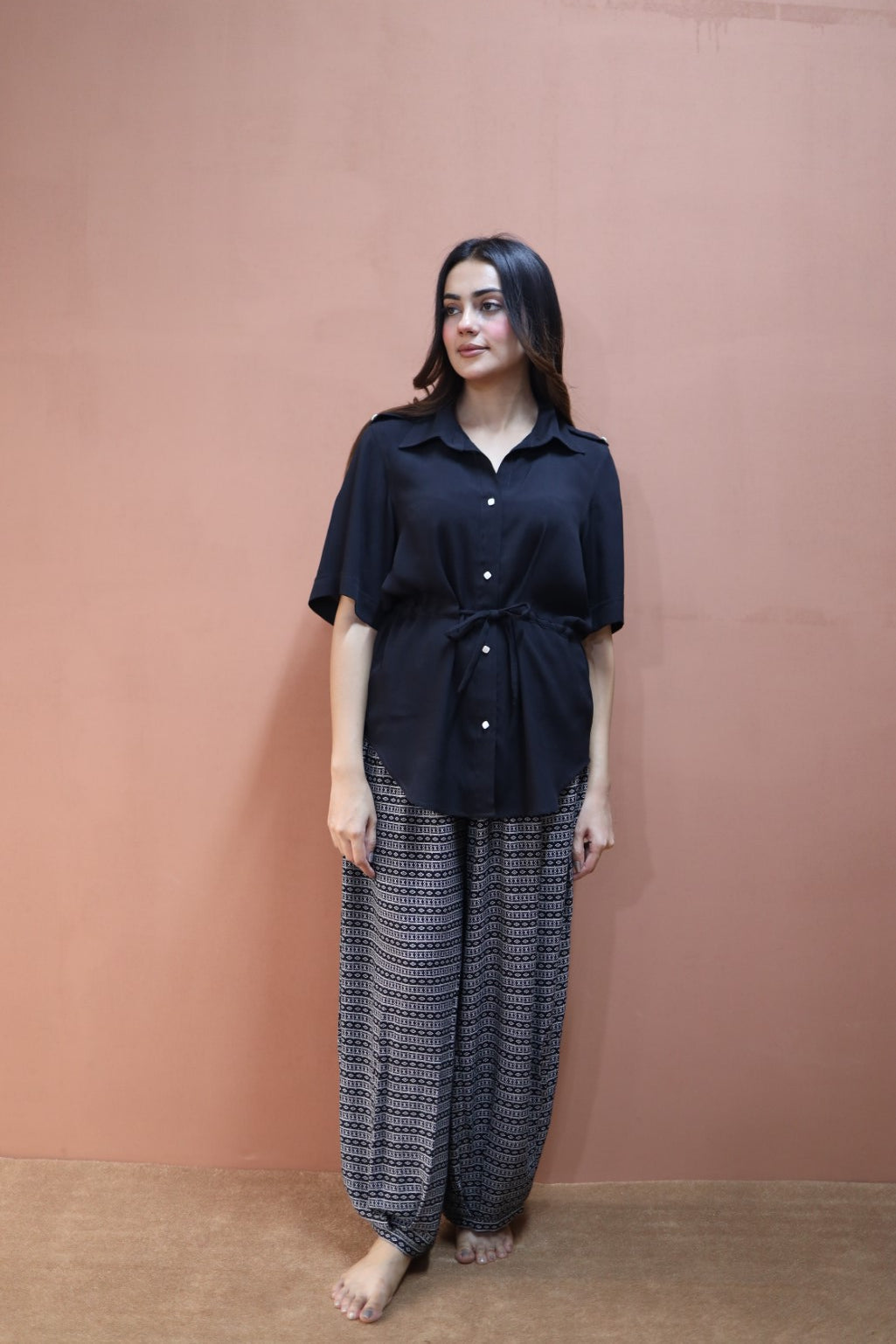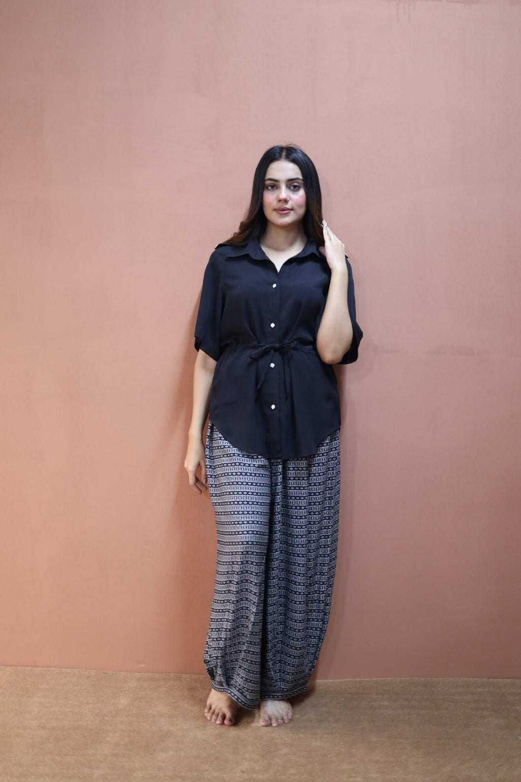 Made from comfortable, draping GRIP fabric, this set features a timeless black and white gingham check pattern. The relaxed-fit collared shirt and wide-leg trousers blend sophisticated style with ease of movement. This ensemble offers a contemporary and chic approach to daily wear that is effortlessly fashionable for any casual or elevated outing.