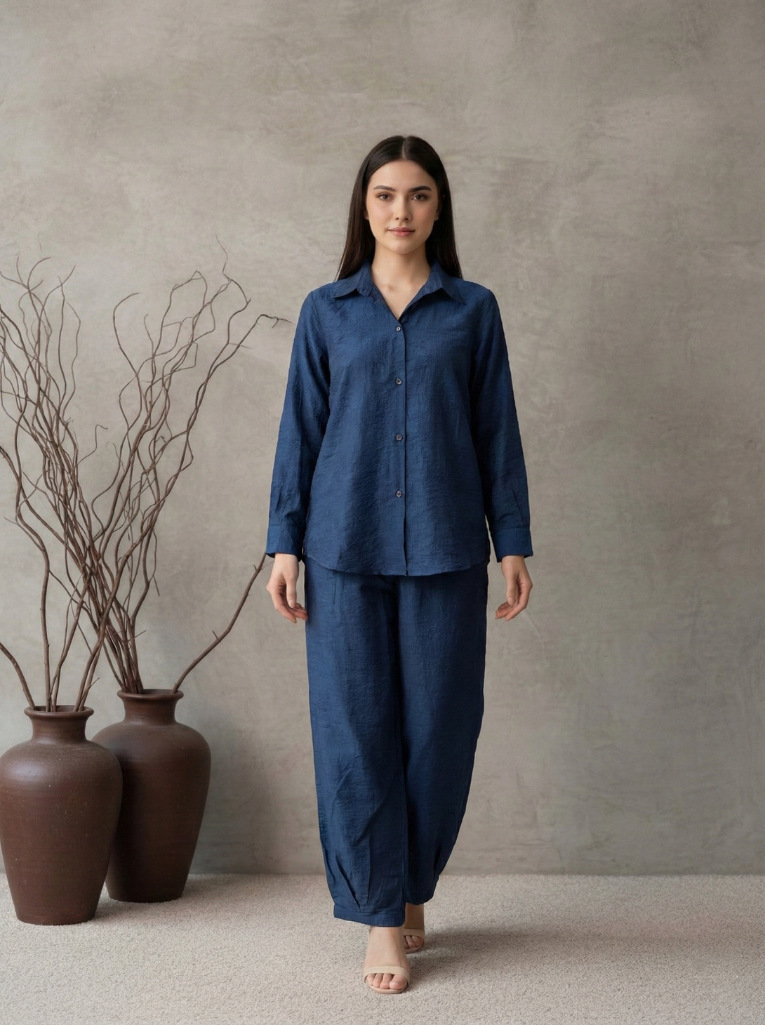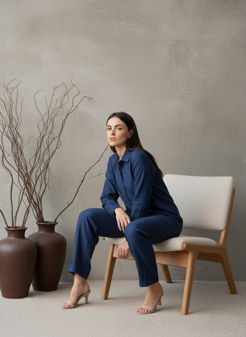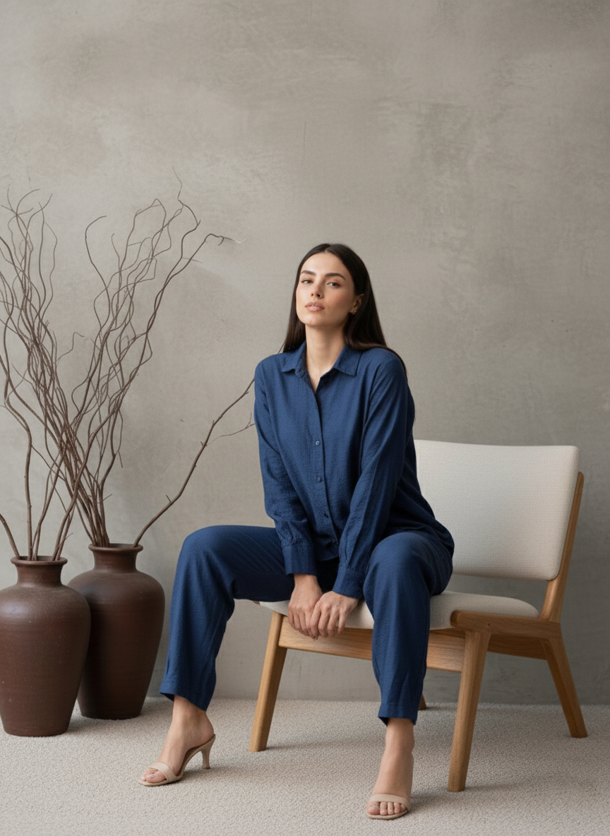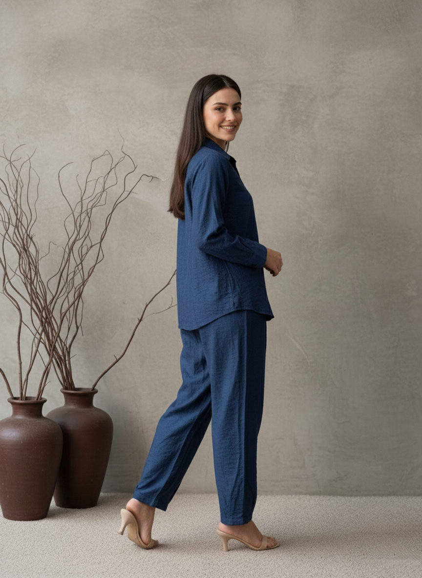 Made from rich, textured Imported Cotton in a deep indigo hue, this monochromatic set focuses on minimalist elegance. The classic collared shirt and relaxed-fit trousers create a contemporary silhouette that is both comfortable and stylish. This versatile ensemble offers an understated yet polished look perfect for any casual or professional setting.