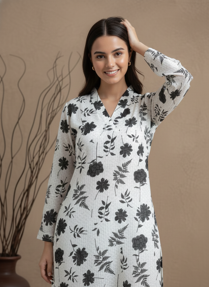 Crafted from light and flowy printed Georgette fabric, this two-piece suit showcases a dramatic monochrome botanical print. The classic kurta style offers comfortable sophistication, making it an ideal choice for elevated daily wear or festive occasions. The breathable georgette drapes elegantly, ensuring a refined and timeless look.