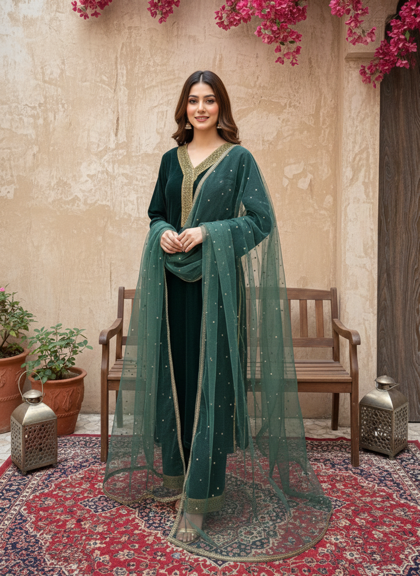Paired with a delicate Embroidered net dupatta, this ensemble brings a soft, ethereal charm that complements the deep, elegant tones of the velvet.