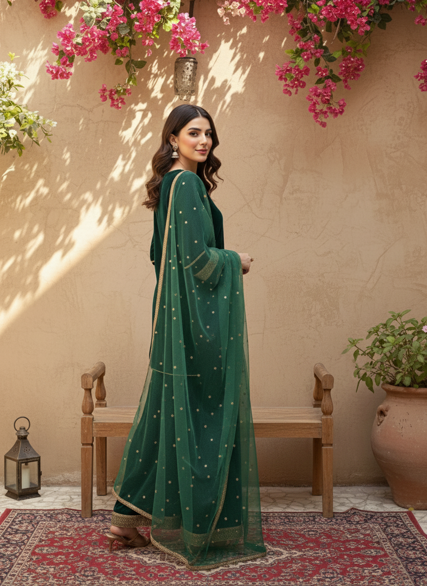 Paired with a delicate Embroidered net dupatta, this ensemble brings a soft, ethereal charm that complements the deep, elegant tones of the velvet.