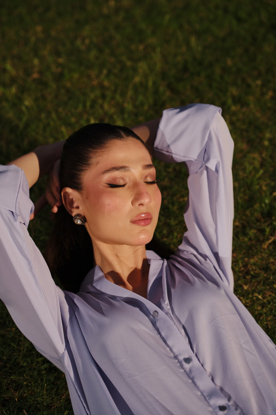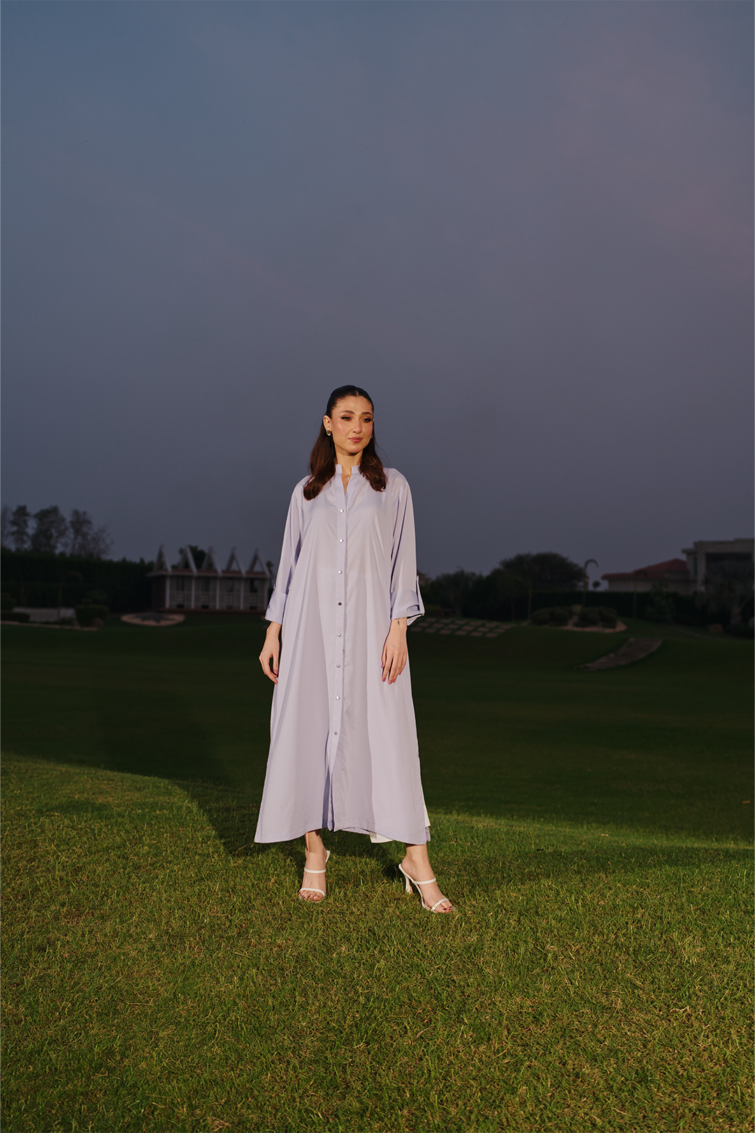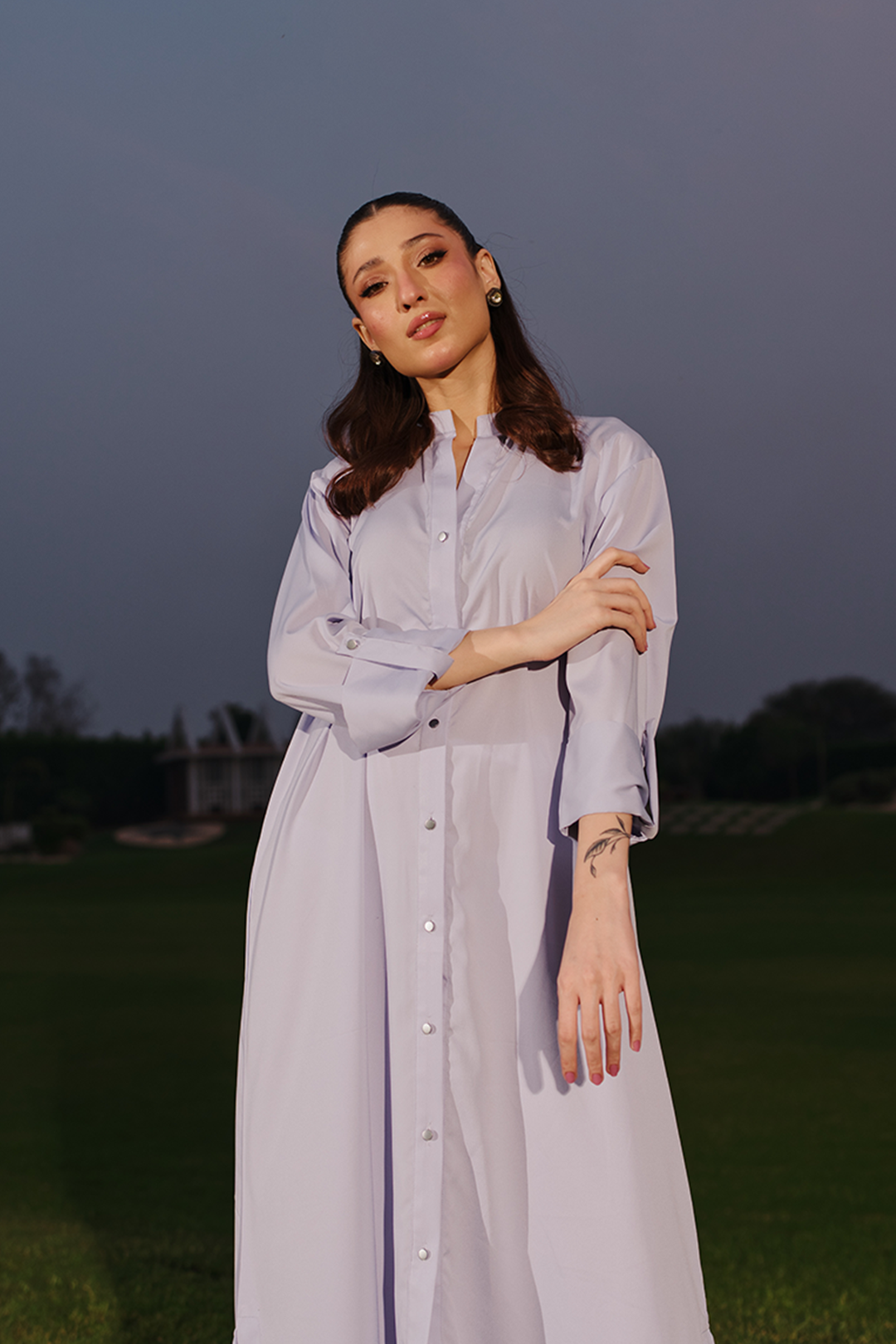 Design Detail: Long dress with a classic collar, button-down front, and folded sleeves enhanced by detailed button touches.