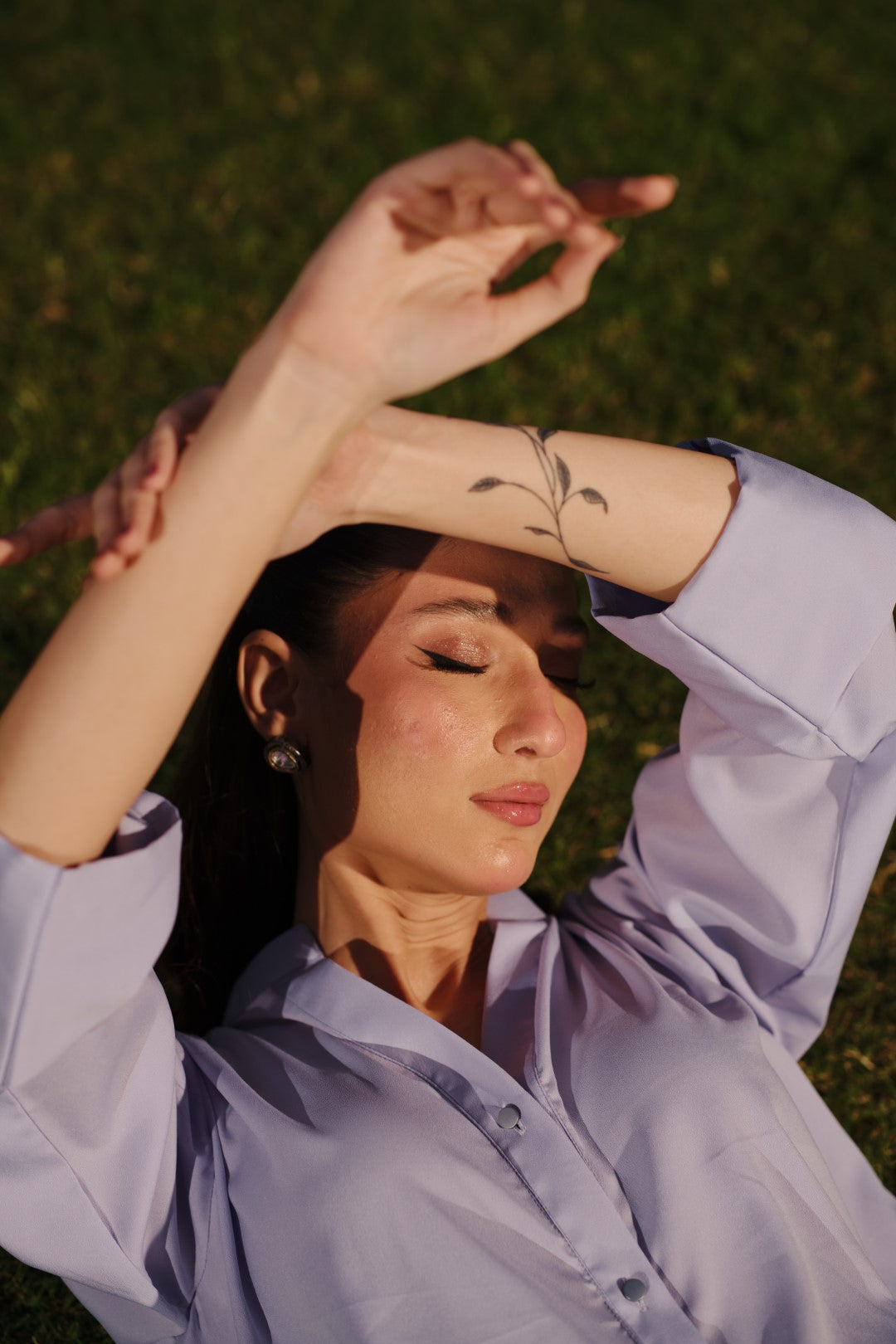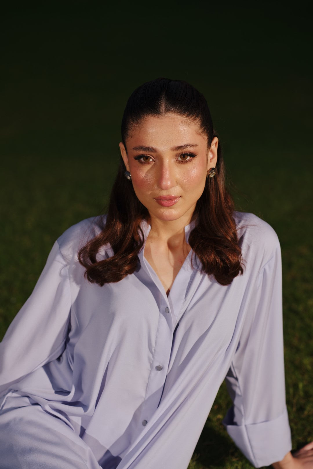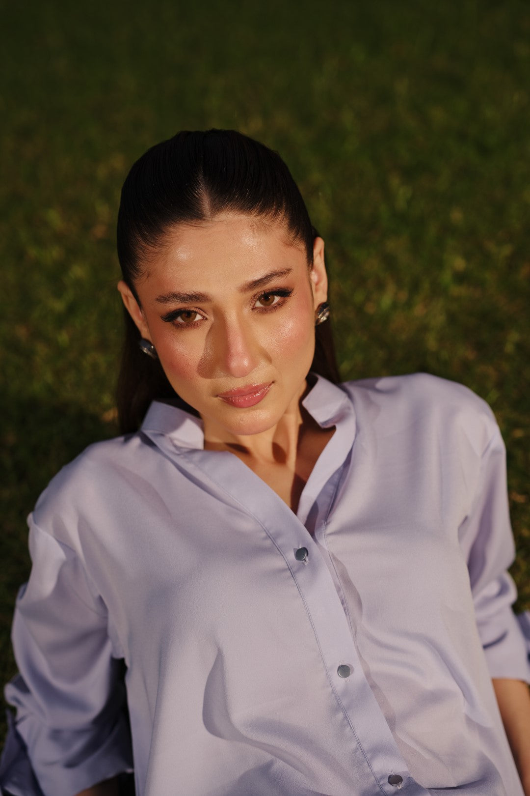 Design Detail: Long dress with a classic collar, button-down front, and folded sleeves enhanced by detailed button touches.