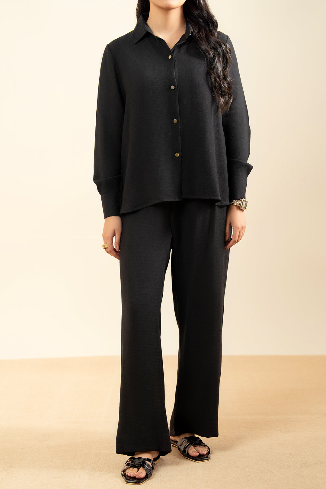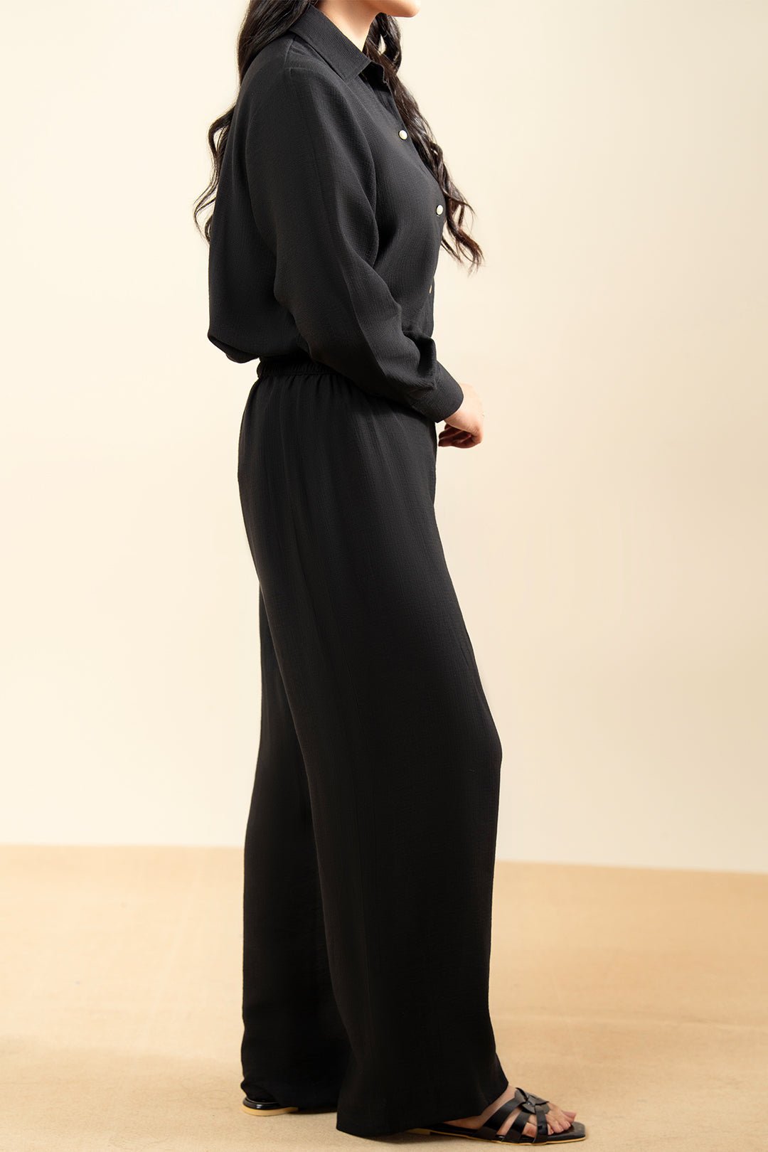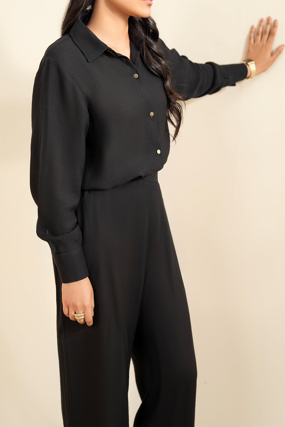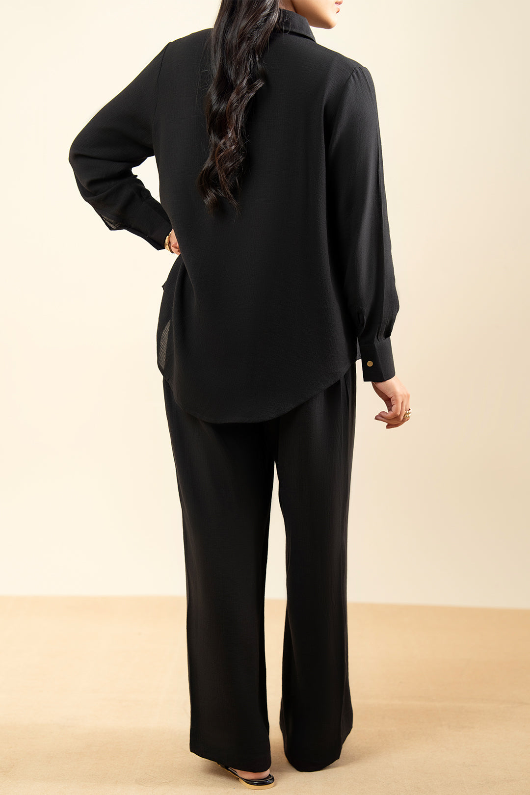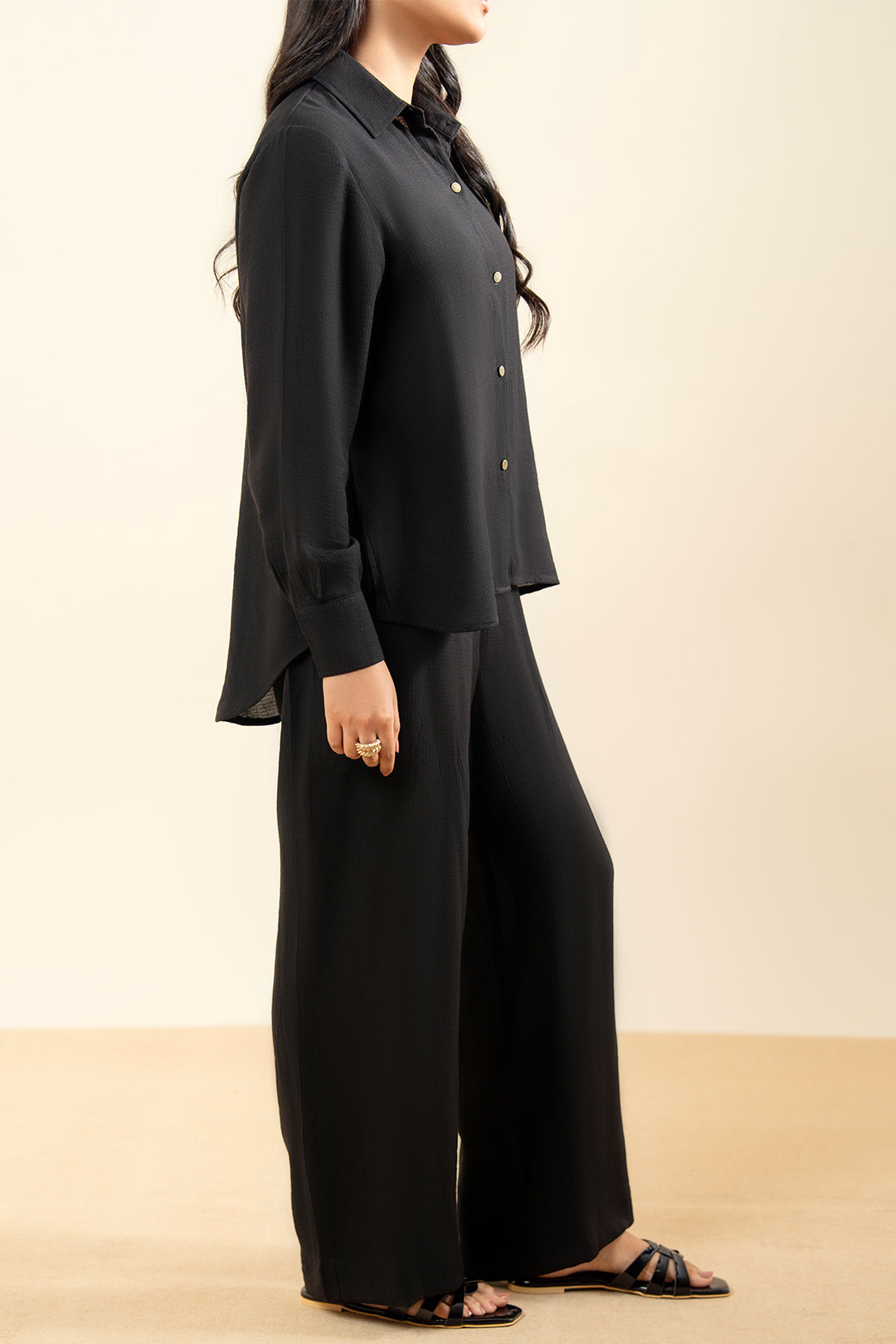 Design Detail: Band collar shirt with drop shoulder and full sleeve button cuff and back pleats