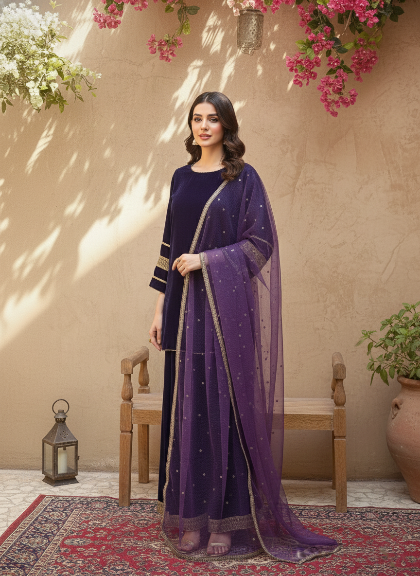 Paired with a delicate Embroidered net dupatta, this ensemble brings a soft, ethereal charm that complements the deep, elegant tones of the velvet.