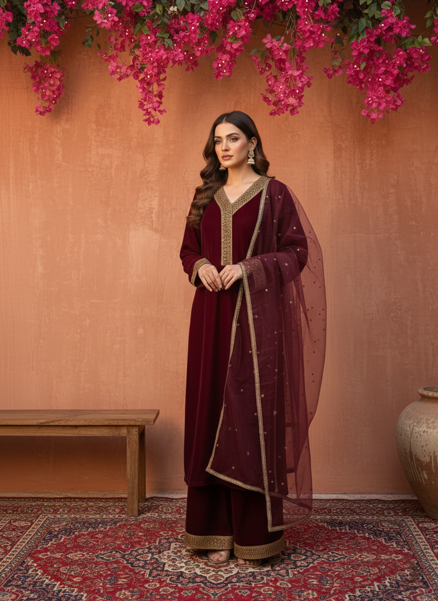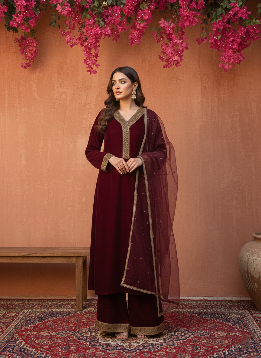 Paired with a delicate Embroidered net dupatta, this ensemble brings a soft, ethereal charm that complements the deep, elegant tones of the velvet.