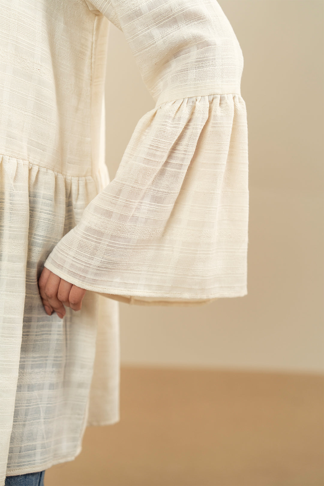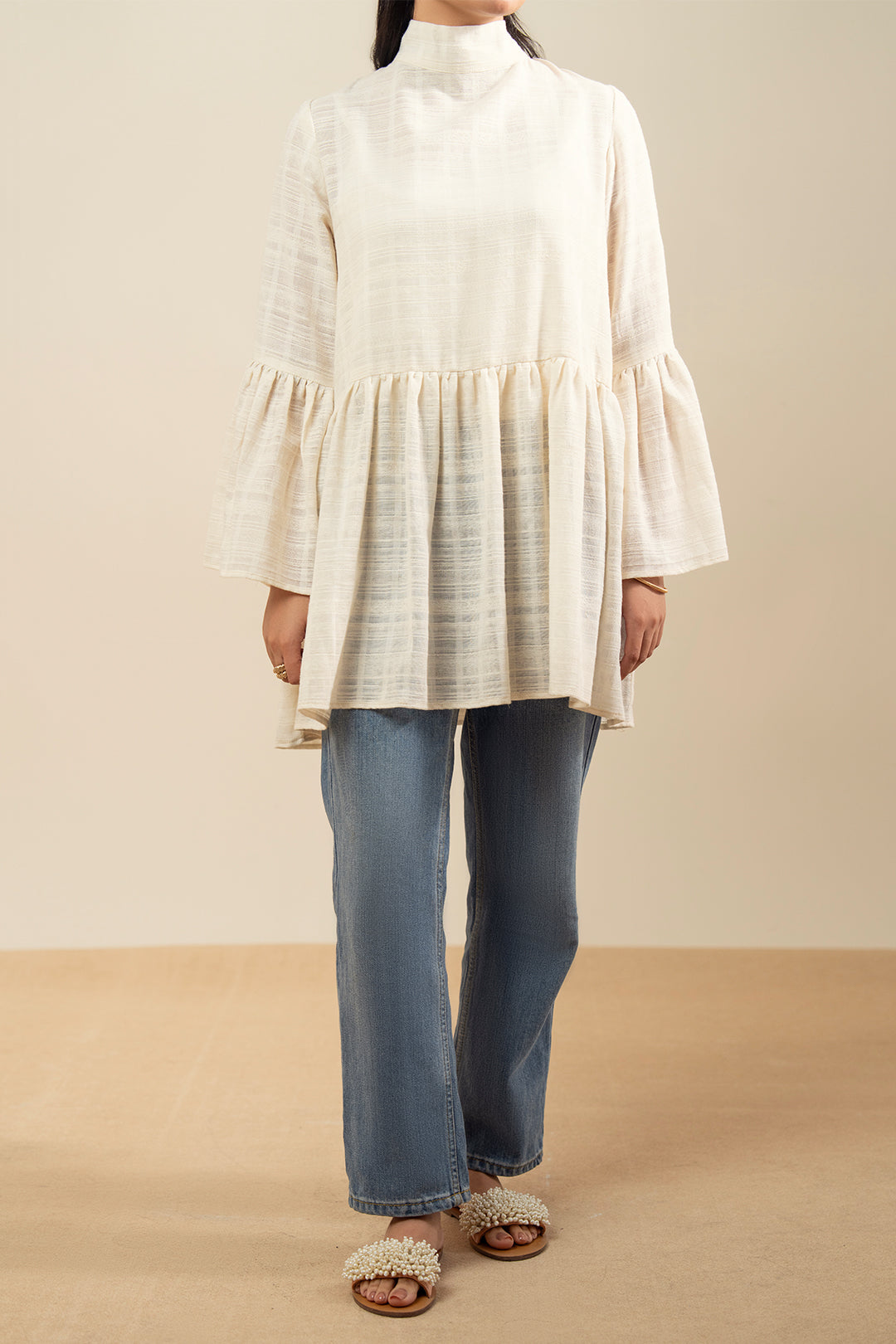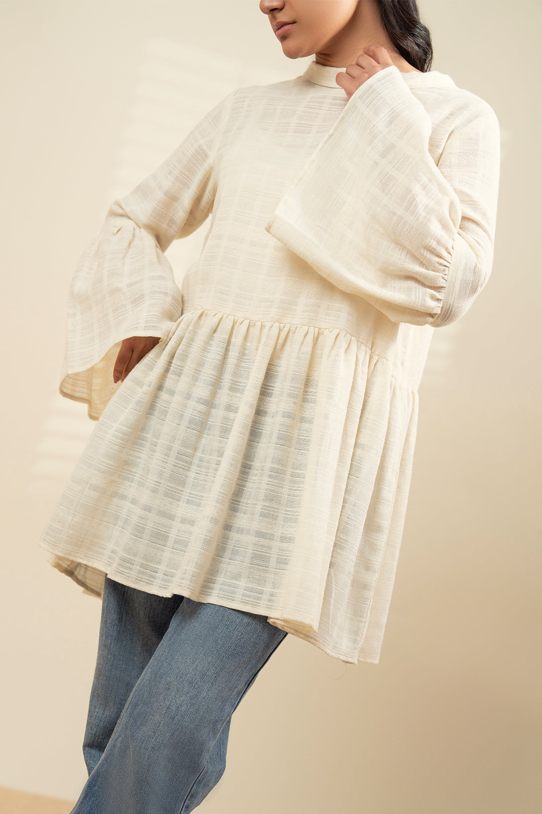 Design Detail: High neck dress with pleat details, full length flared sleeves with pleat details