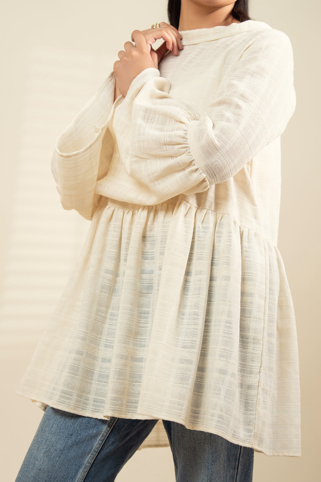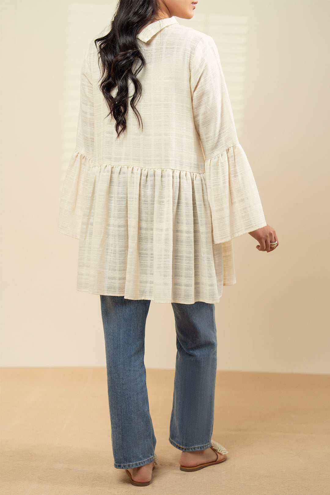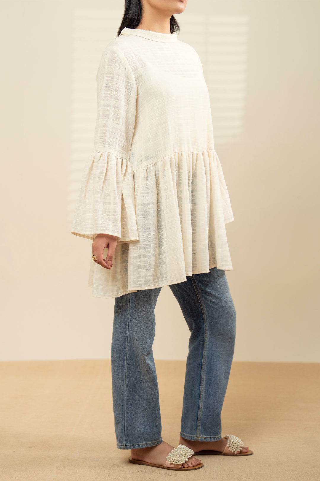 Design Detail: High neck dress with pleat details, full length flared sleeves with pleat details