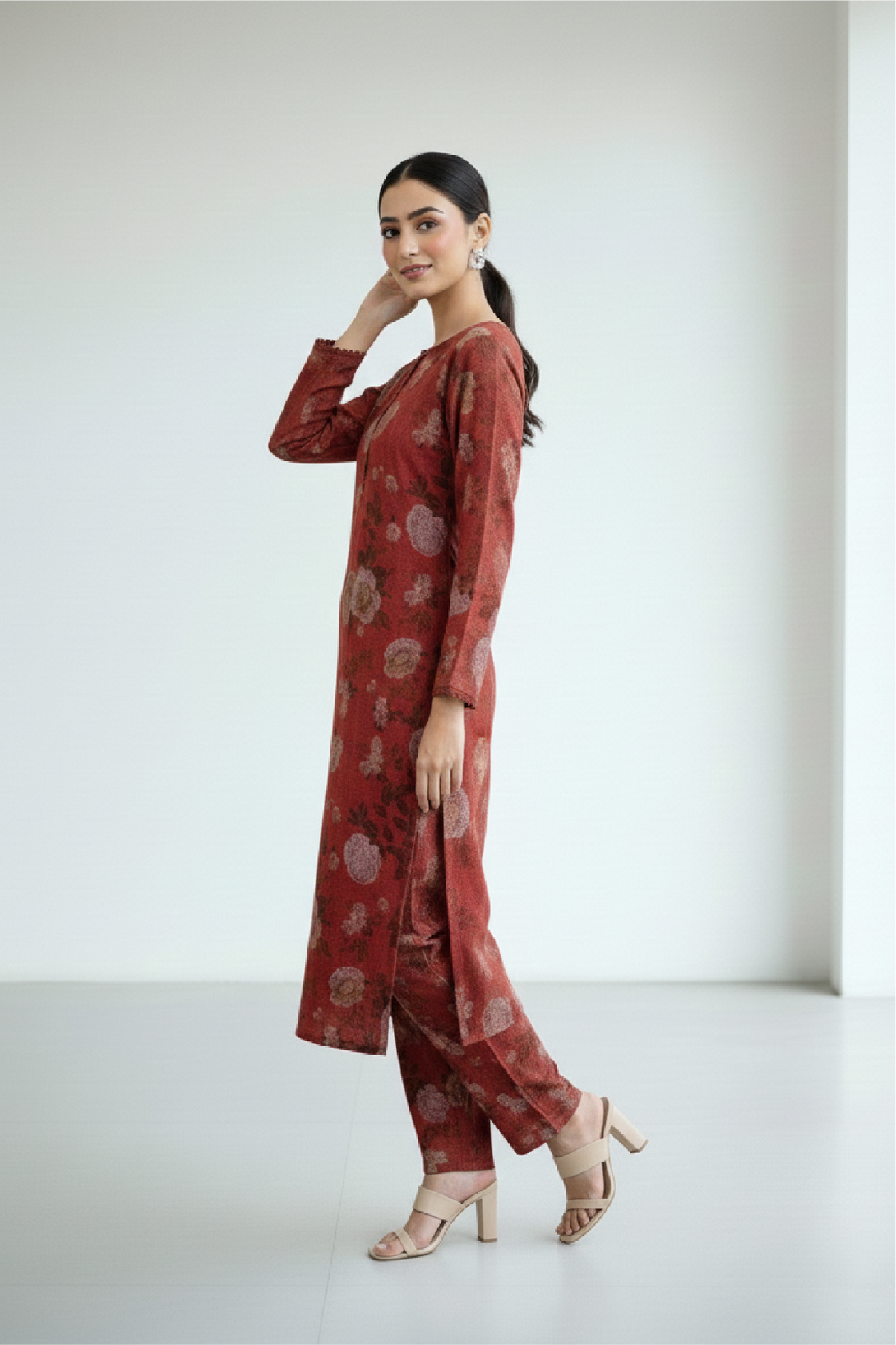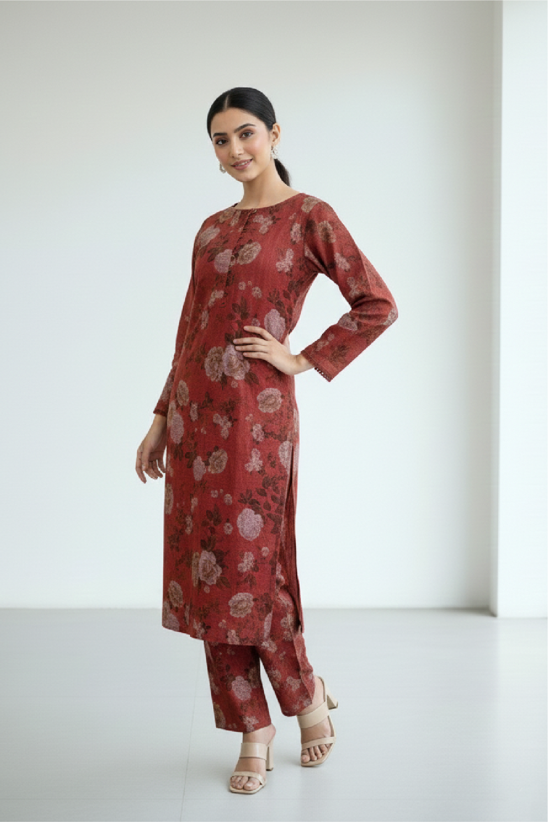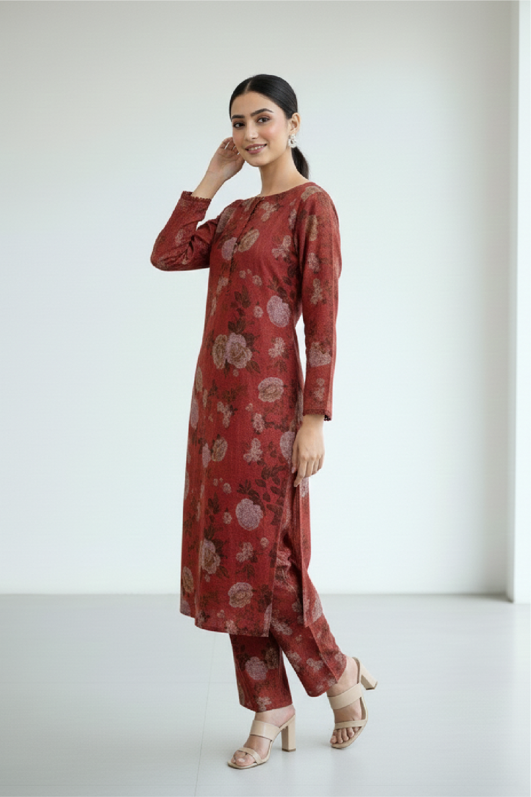 Shirt & Trouser: A classic straight-cut suit in a warm terracotta hue adorned with a delicate all-over rose print. The set offers a timeless silhouette perfect for sophisticated festive or formal gatherings.