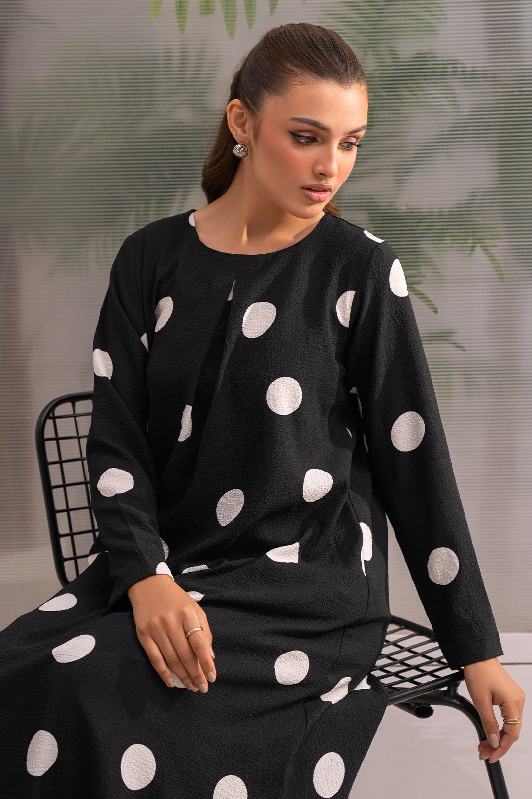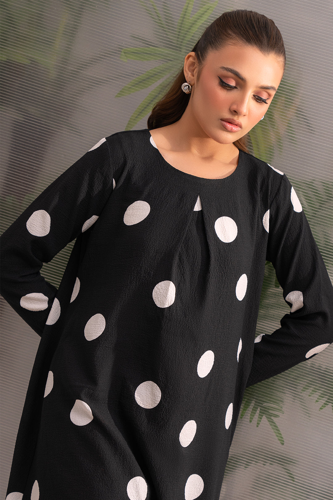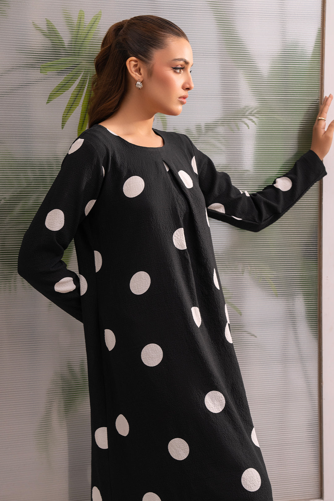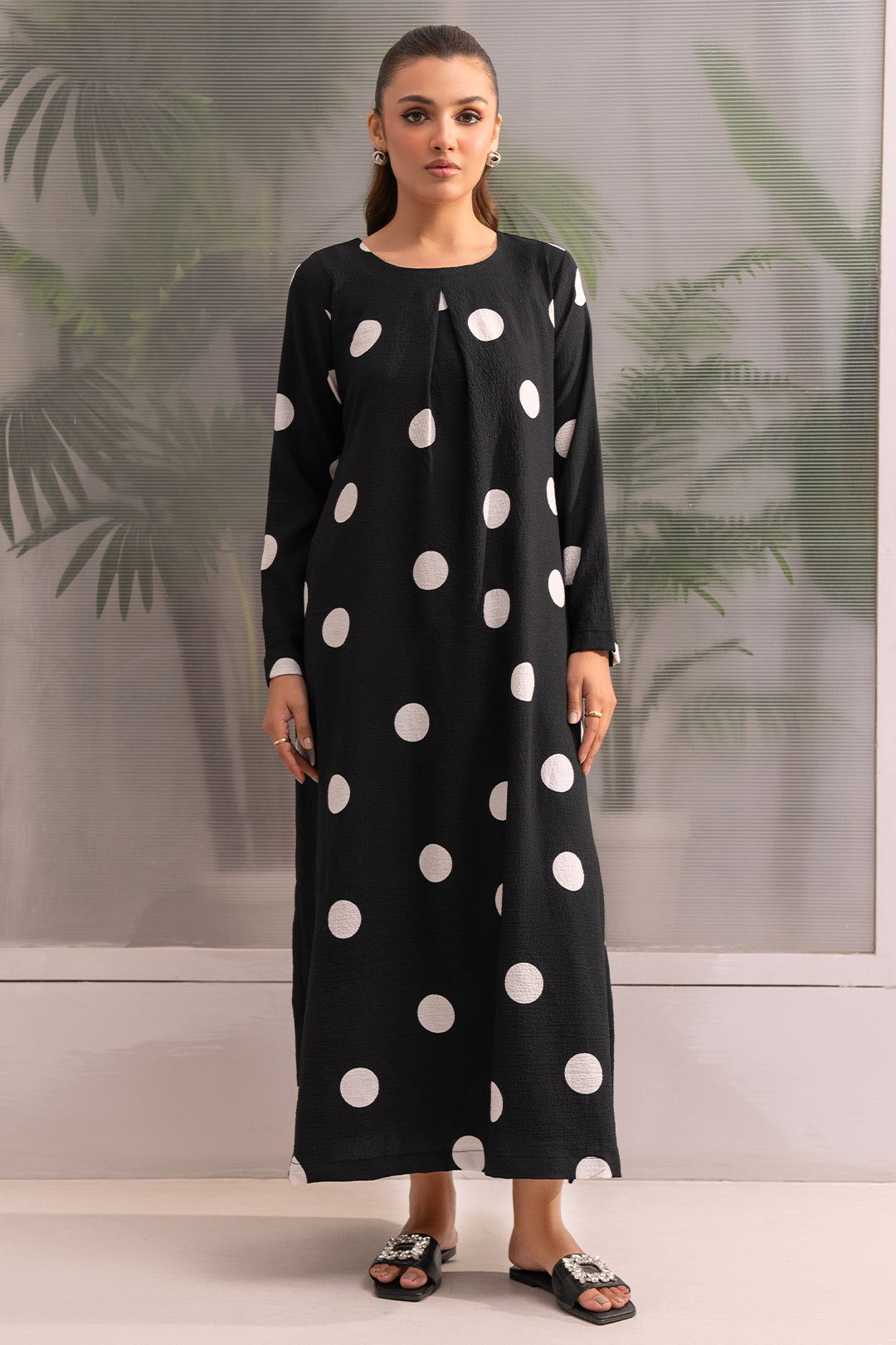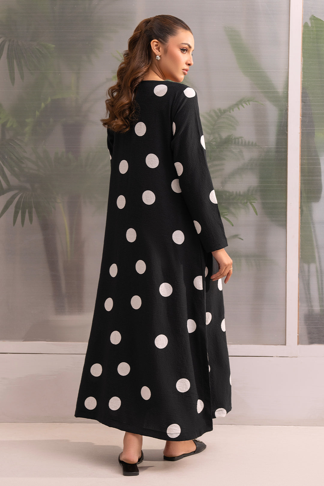 Dramatic Flair Polka Dot Dress Elevate your style with this show-stopping long flare dress! The box pleat design adds a touch of sophistication, while the bold black and white abrupt polka dot print creates a modern and eye-catching look. This dress is designed to make you feel confident and stylish, with a flowy silhouette that skims the body and a dramatic print that's sure to turn heads.